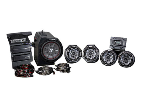 For mids and highs, a set of KICKER KM-Series weather-proof speakers are mounted in a pair of custom SSV Works kick-panel enclosures. The enclosures are mounted high in the kick panel, allowing plenty of leg room during the ride. Another set of cage-mounted SSV Works speaker pods with KM speakers are mounted above the rear seats for additional volume and sound quality.